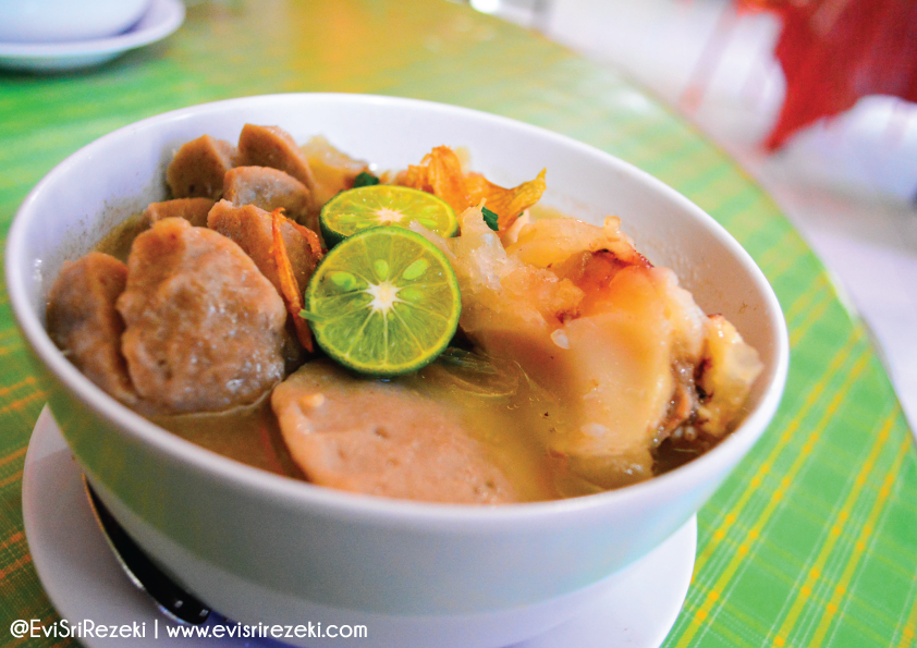 kikil, bakso bulat kecil dan besar, bakso gepeng. Sambil menunggu pesanan, Jamur Kecil disuguhi welcome snack buat nyemil. Begitu mie kocok datang, Jamur Kecil segera menyeruput kuah